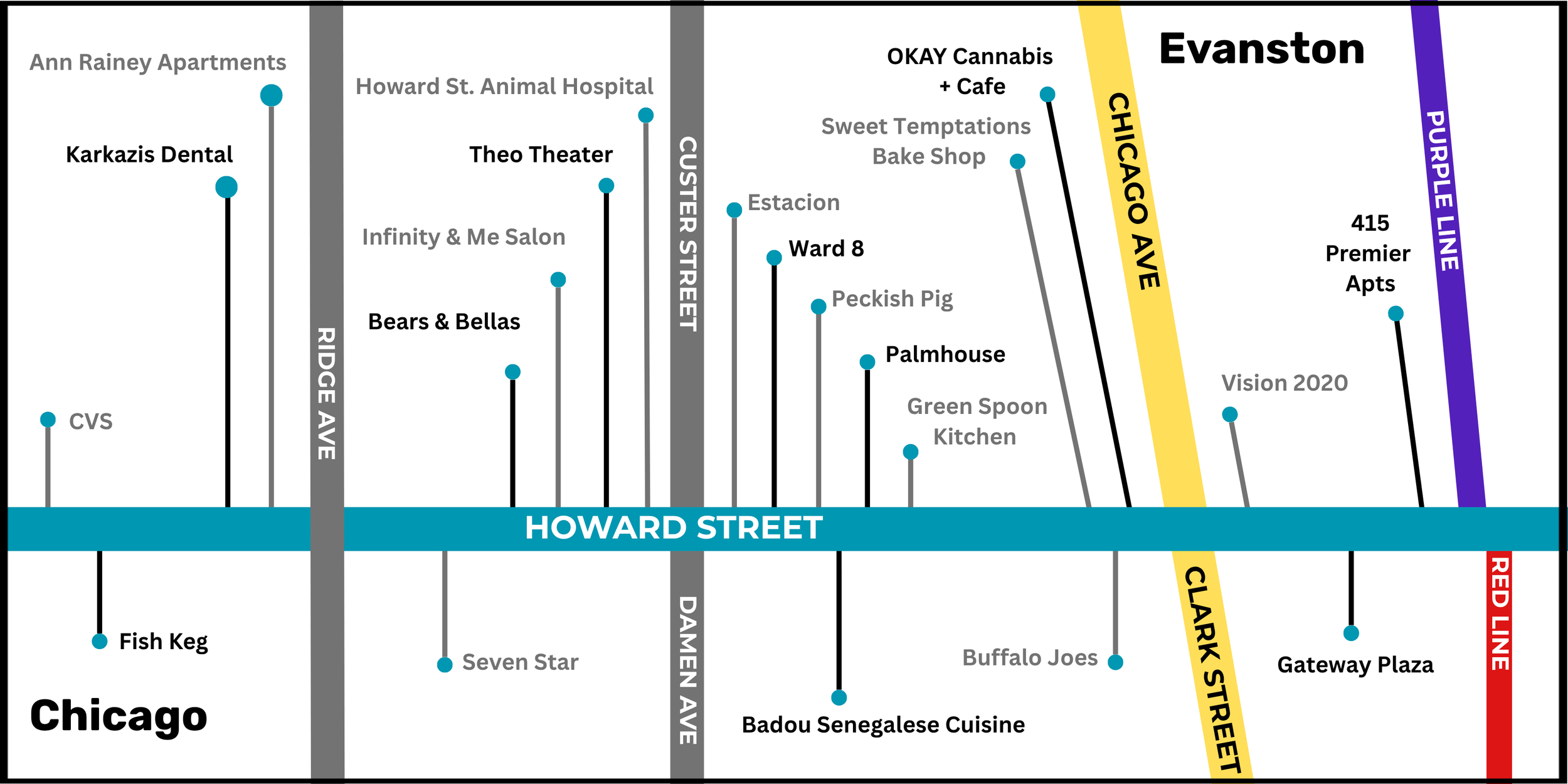 HOWARD STREET BUSINESS DISTRICT BEGINS JUST EAST OF CHICAGO AVE/CLARK STREET ON THE EAST SIDE AND RUNS WEST TO ASBURY/WESTERN. mETERED PARKING IS AVAILABLE ON BOTH SIDES OF THE STREET, WITH THE EVANSTON SIDE & CHICAGO SIDE UTILIZING 2 SEPARATE PARKING APPS (PARKEVANSTON & PARKCHICAGO). ADDITIONALLY, A CITY OF EVANSTON METERED PARKING LOT IS LOCATED AT 719 HOWARD ST. JUST EAST OF THEO THEATER. EVANSTON SIDE STREETS ARE PERMITTED FOR EVANSTON RESIDENTS ONLY AFTER 6 PM!